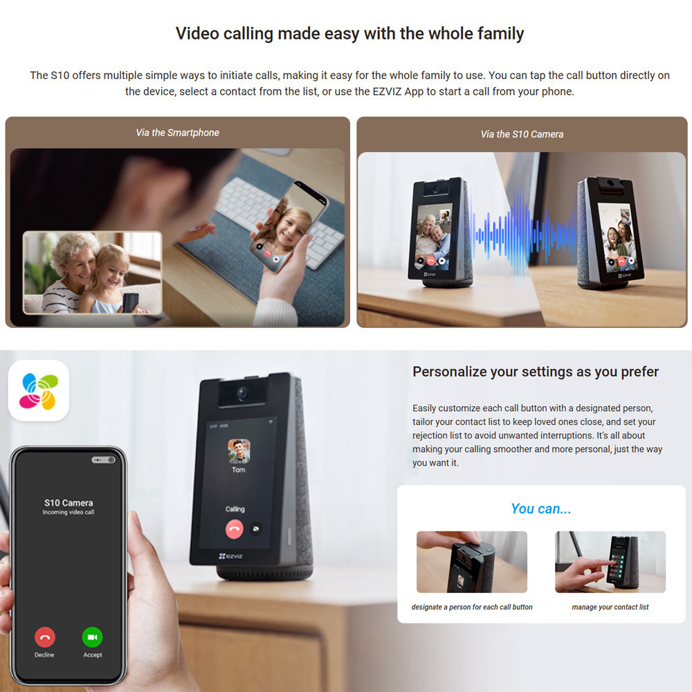 The S10 offers multiple simple ways to initiate calls, making it easy for the whole family to use. You can tap the call button directly on the device, select a contact from the list, or use the EZVIZ App to start a call from your phone.