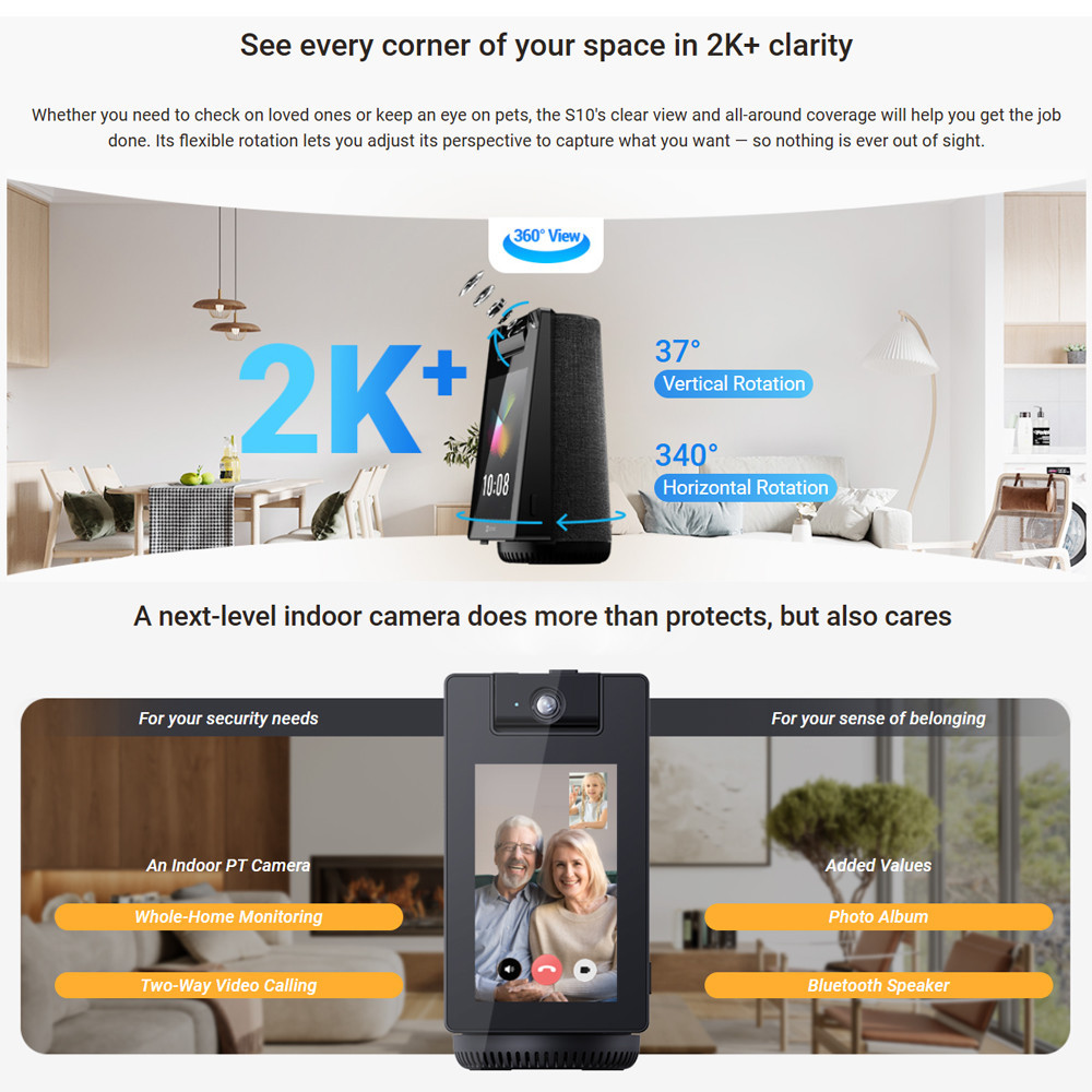 Whether you need to check on loved ones or keep an eye on pets, the S10's clear view and all-around coverage will help you get the job done. Its flexible rotation lets you adjust its perspective to capture what you want — so nothing is ever out of sight.
