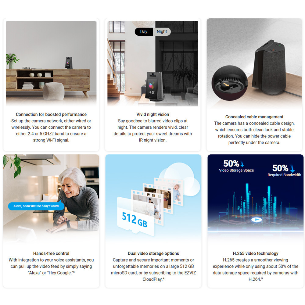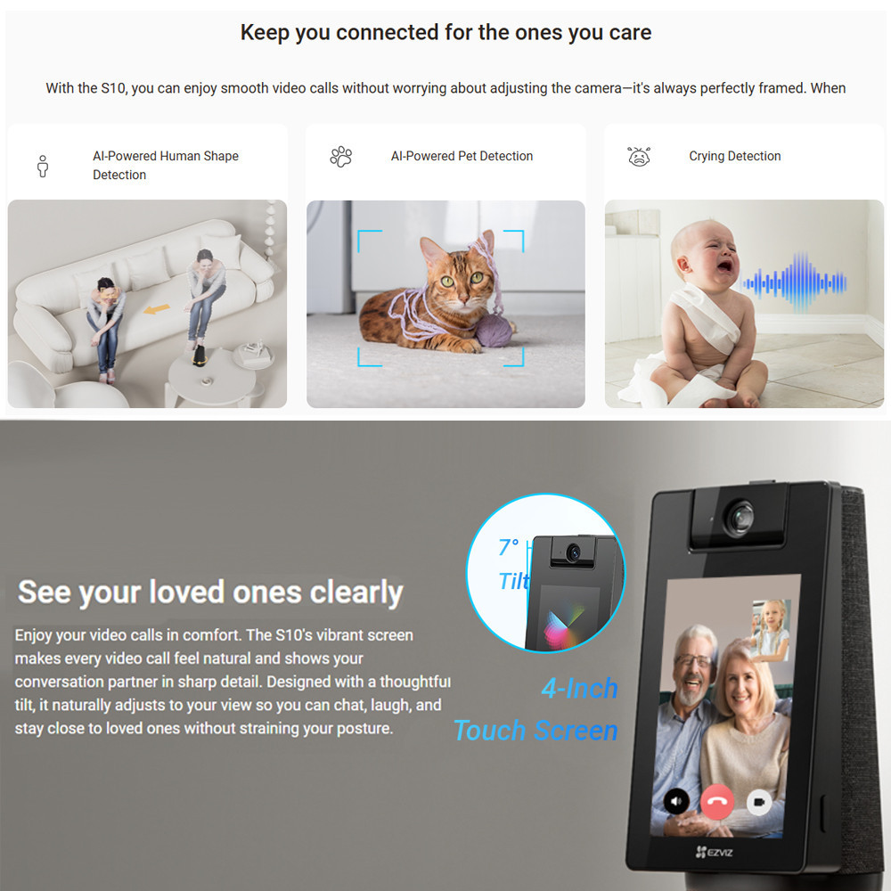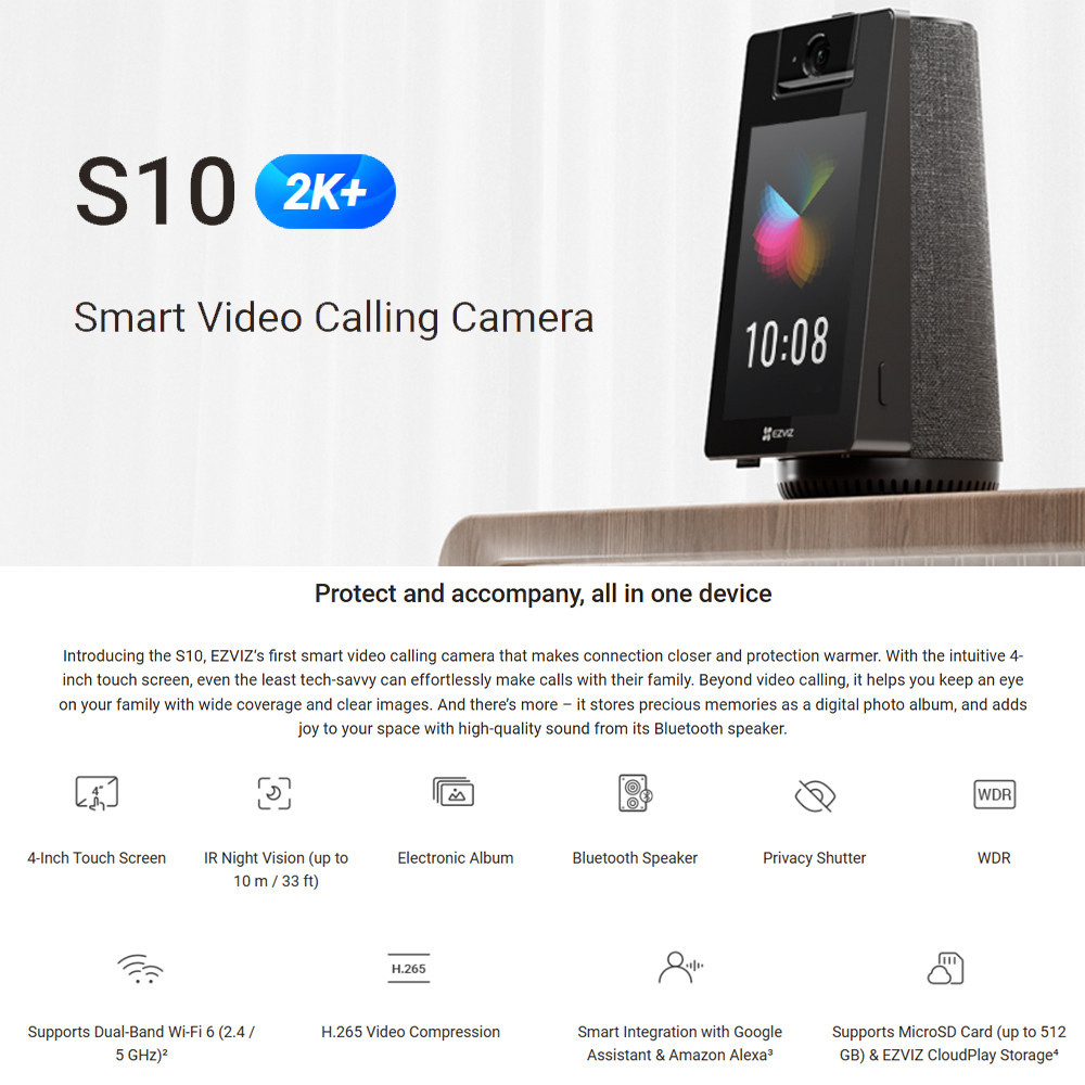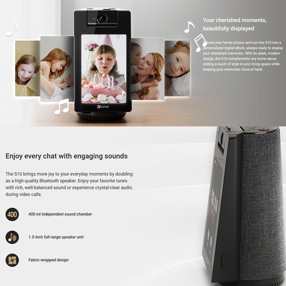 Introducing the S10, EZVIZ‘s first smart video calling camera that makes connection closer and protection warmer. With the intuitive 4-inch touch screen, even the least tech-savvy can effortlessly make calls with their family. Beyond video calling, it helps you keep an eye on your family with wide coverage and clear images. And there’s more – it stores precious memories as a digital photo album, and adds joy to your space with high-quality sound from its Bluetooth speaker.